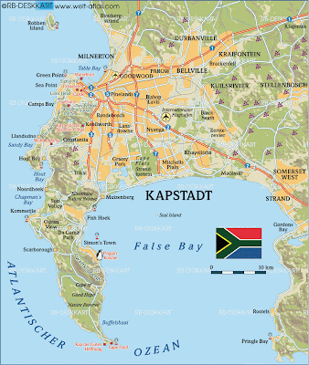 Cape Town lives up to its billing as one of the world's most beautiful cities, on par with Rio de Janeiro and Sydney. We spent much of day doing a perhaps overly ambitious hike down from Table Mountain, which runs through and looms over Cape Town, as shown below.